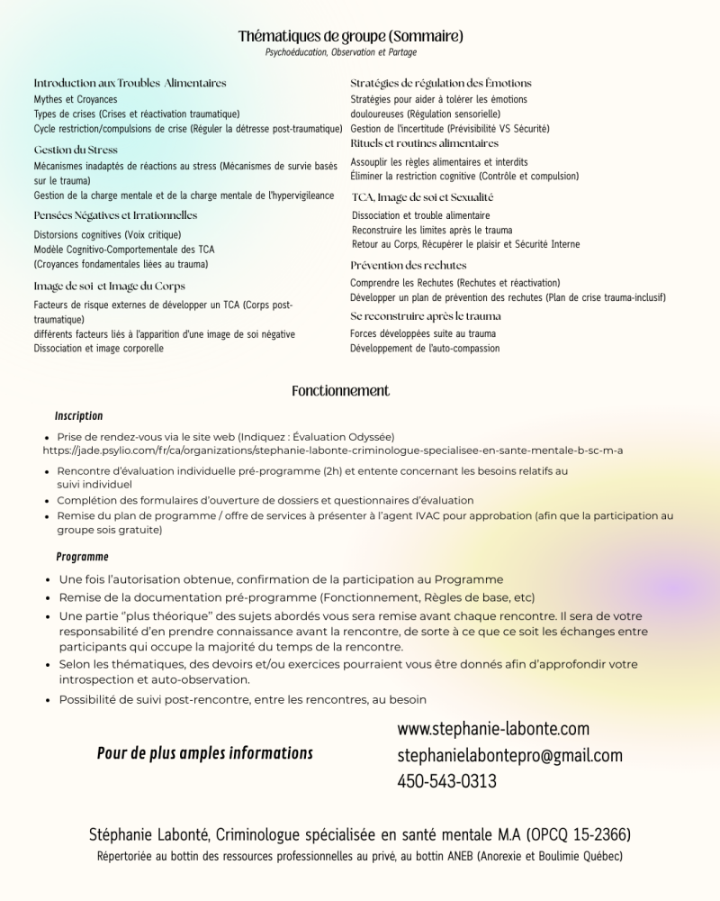 Objectif: Travailler de façon simultanée sur les conséquences de l'acte criminel subit (en individuel) et sur la relation avec le corps et l'alimentation.